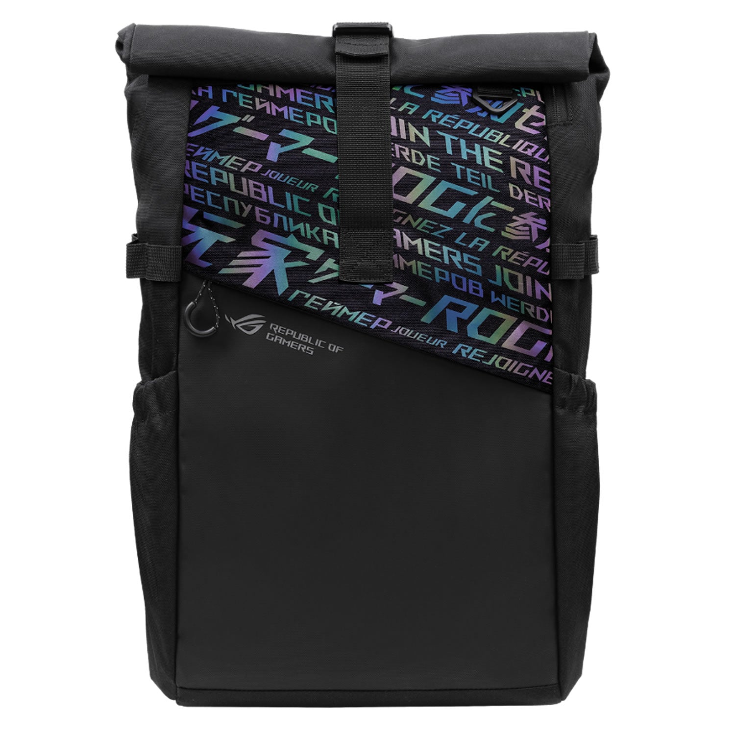 The ROG BP4701 Gaming Backpack delivers a bold combination of futuristic aesthetics and practical design. Its reflective, holographic cybertext pattern and high‑visibility ROG logo make a striking impression, while its structured layout keeps your gear organized and protected.