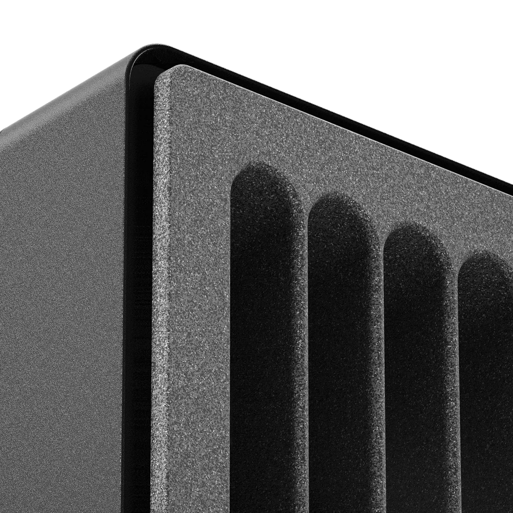 - Minimalist stone textured front panel finish with clean SimpliCable routing system.