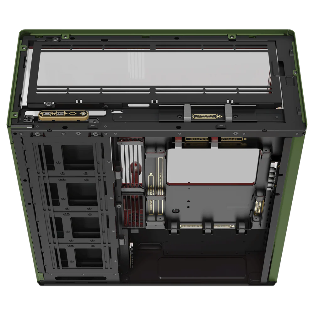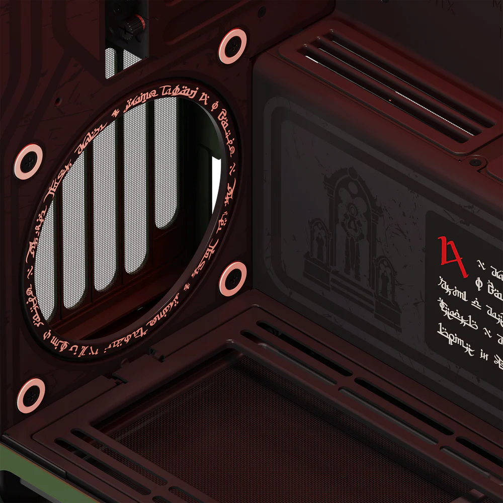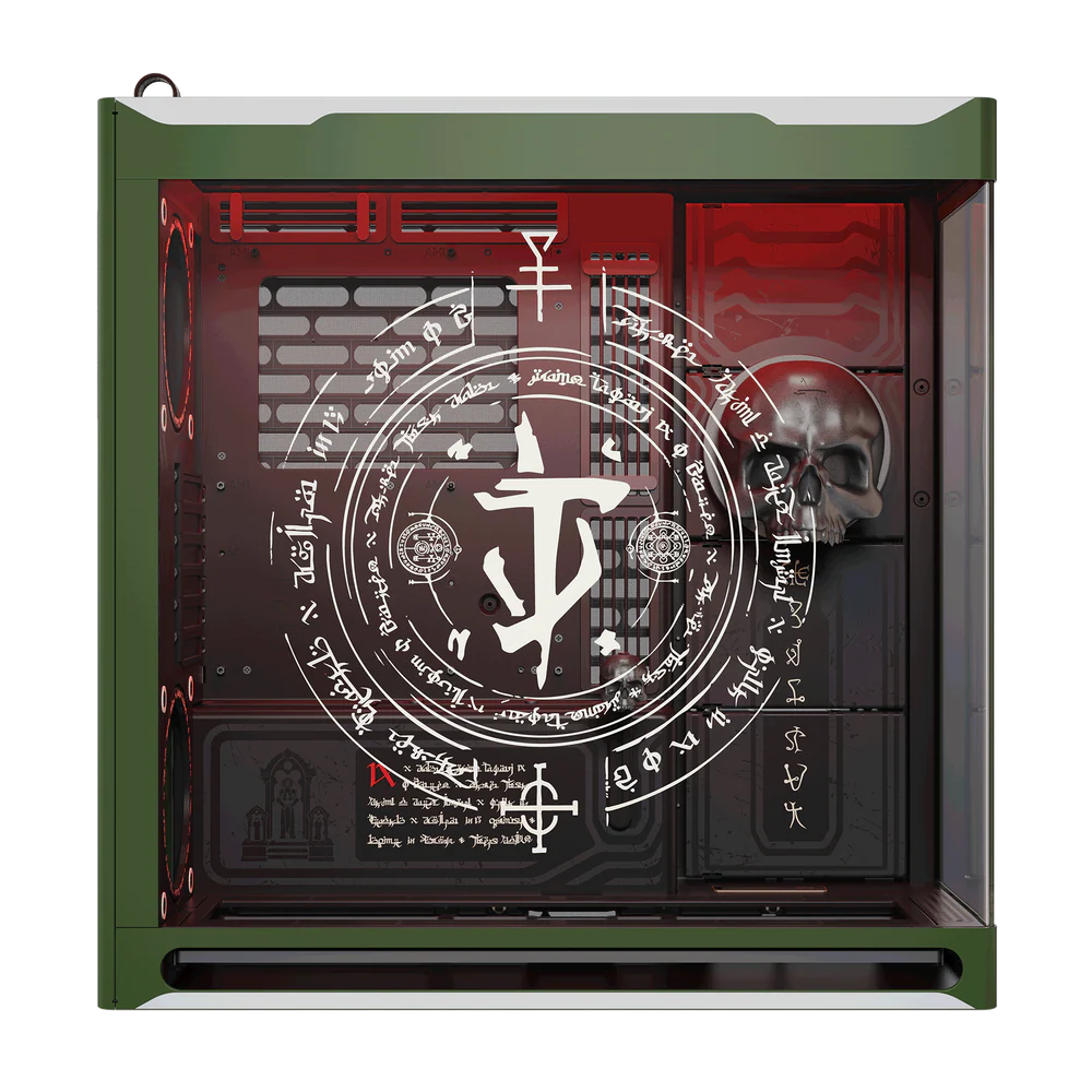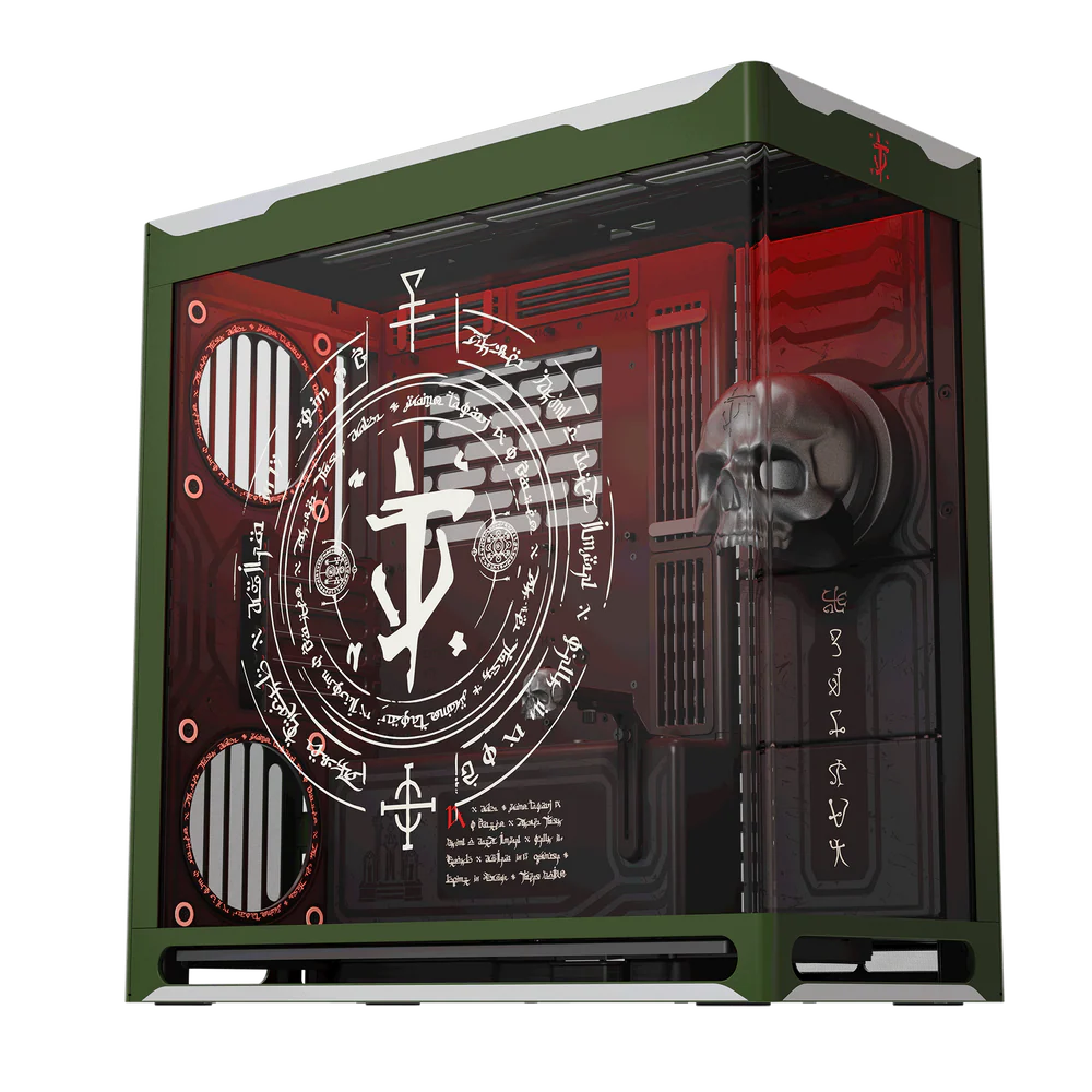 Multi-layer DOOM printing: The exterior is a striking DOOM Slayer green that’s accented with metallic details, evoking the Praetor Suit armor, while the UniSheet tempered glass panel and interior surfaces feature multi-layer, screen-printed white sigils and runes.