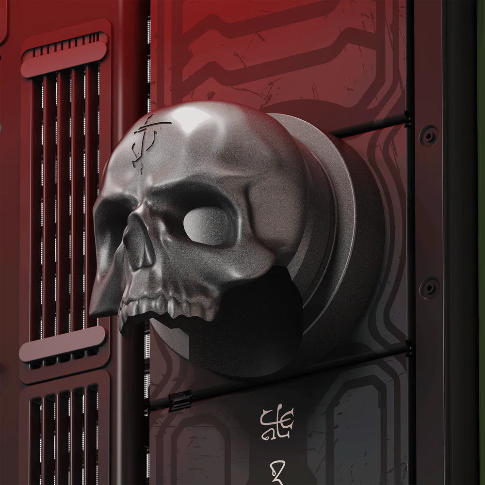 Exclusive magnetic DOOM skull accessory: A stylized magnetic metal skull. Position the large skull inside the case to cover a cooling reservoir, or mount it outside as a brutal headphone hanger. Your trophy, your way.