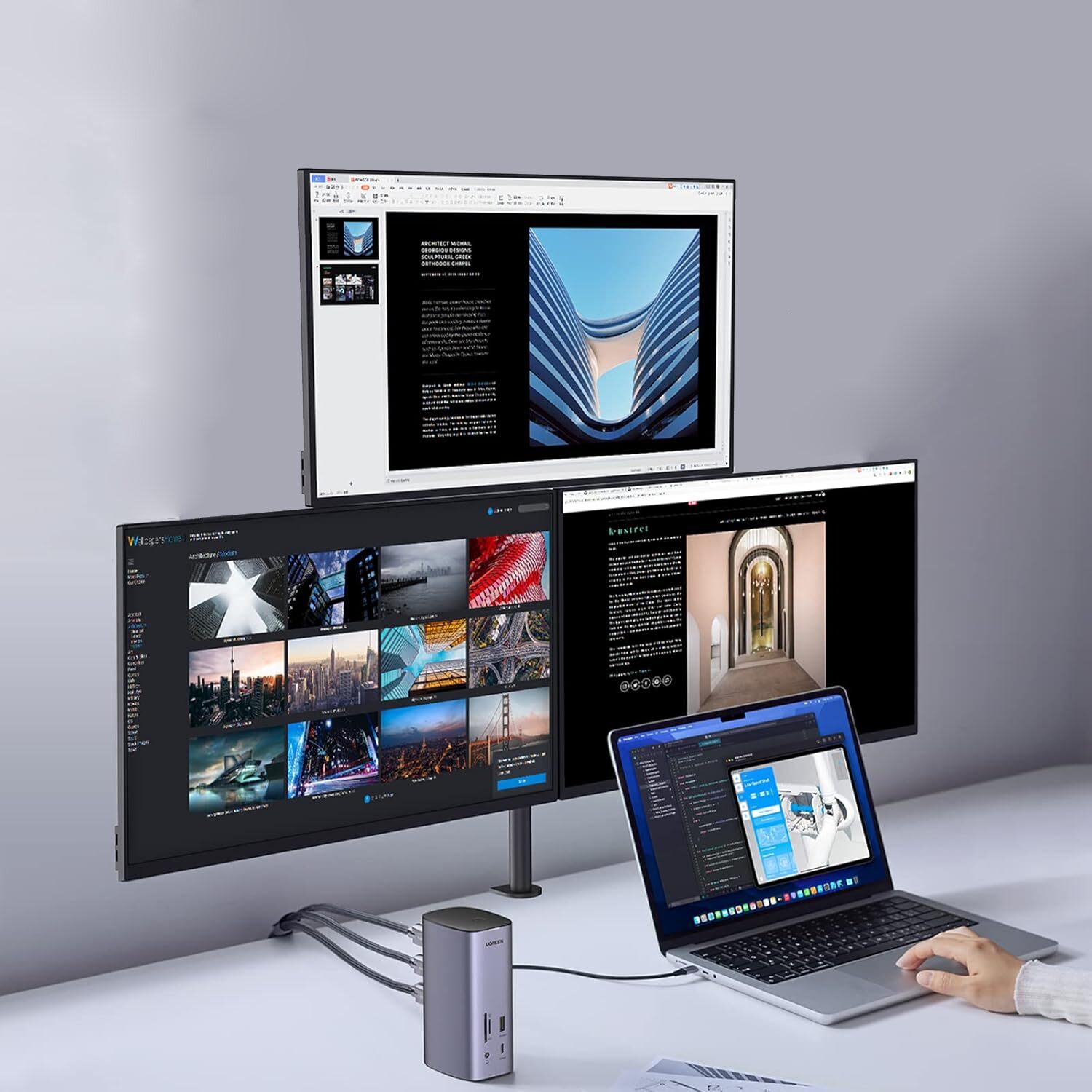 Featuring 12 versatile ports, the UGREEN Revodok Pro 12-in-1 Type-C Docking Station allows you to connect multiple devices, improving workflow efficiency and reducing cable clutter. the UGREEN Docking Station is perfect for multitaskers & power users due to its triple display output support - allowing for even more productivity across extended displays. Whether you're using macOS or Windows, the station ensures smooth compatibility. It even supports the latest MacBook M1 and M2 chips.