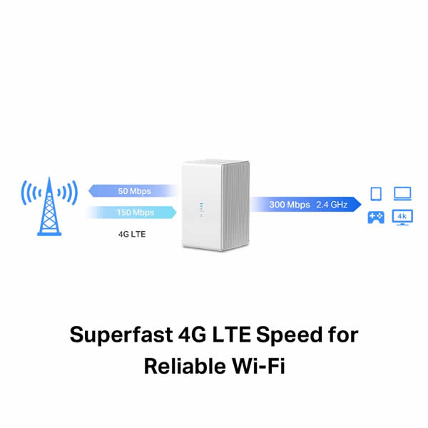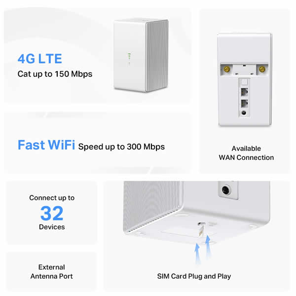 4G network – Share internet access with up to 32 Wi-Fi devices and enjoy download speeds of up to 150 Mbps
