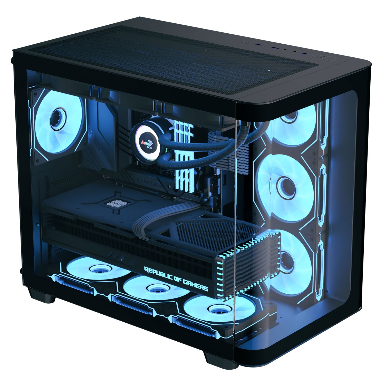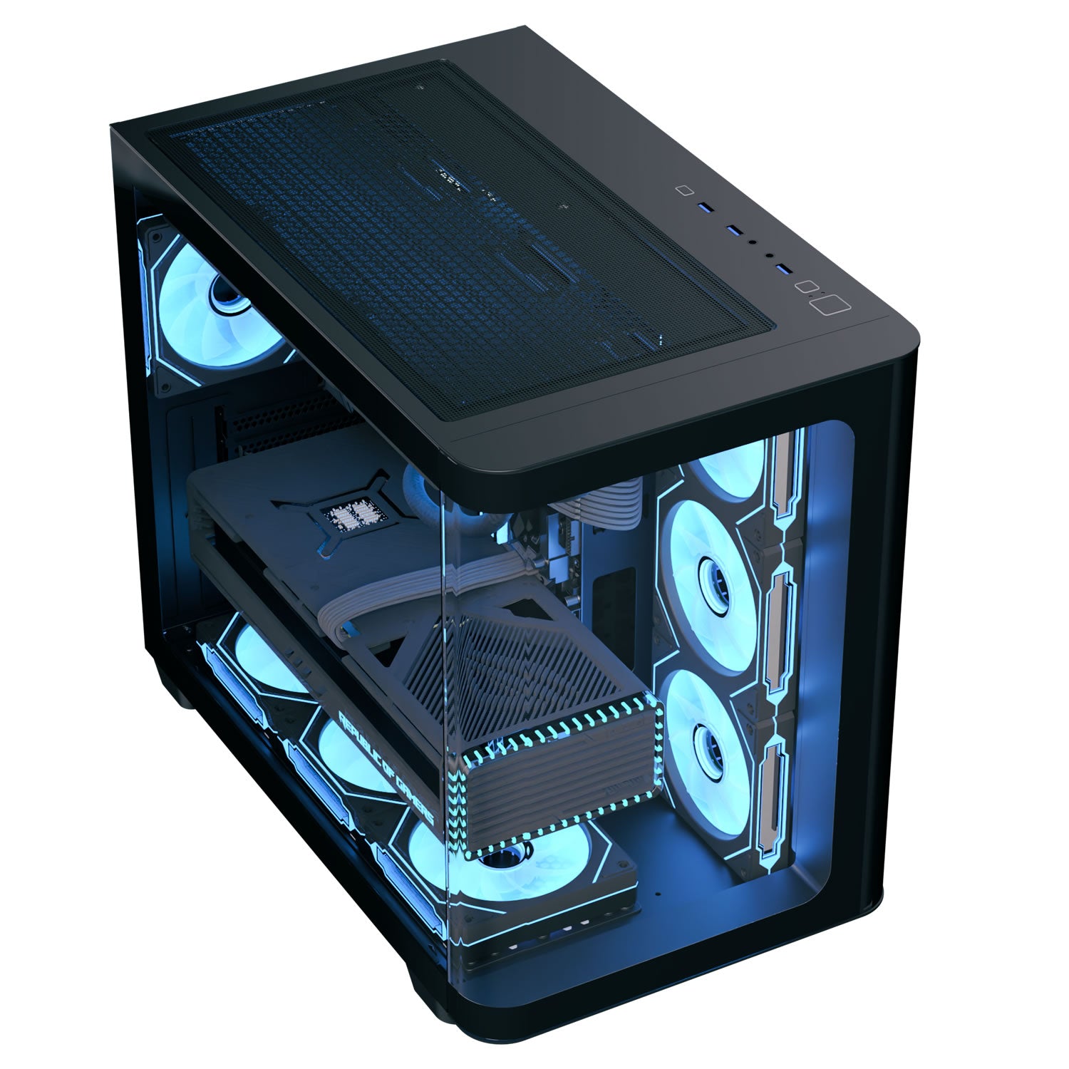 Mid-tower case featuring full tempered glass front and side panels for interior viewing.