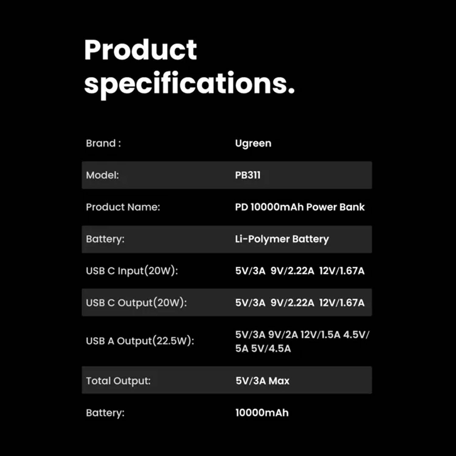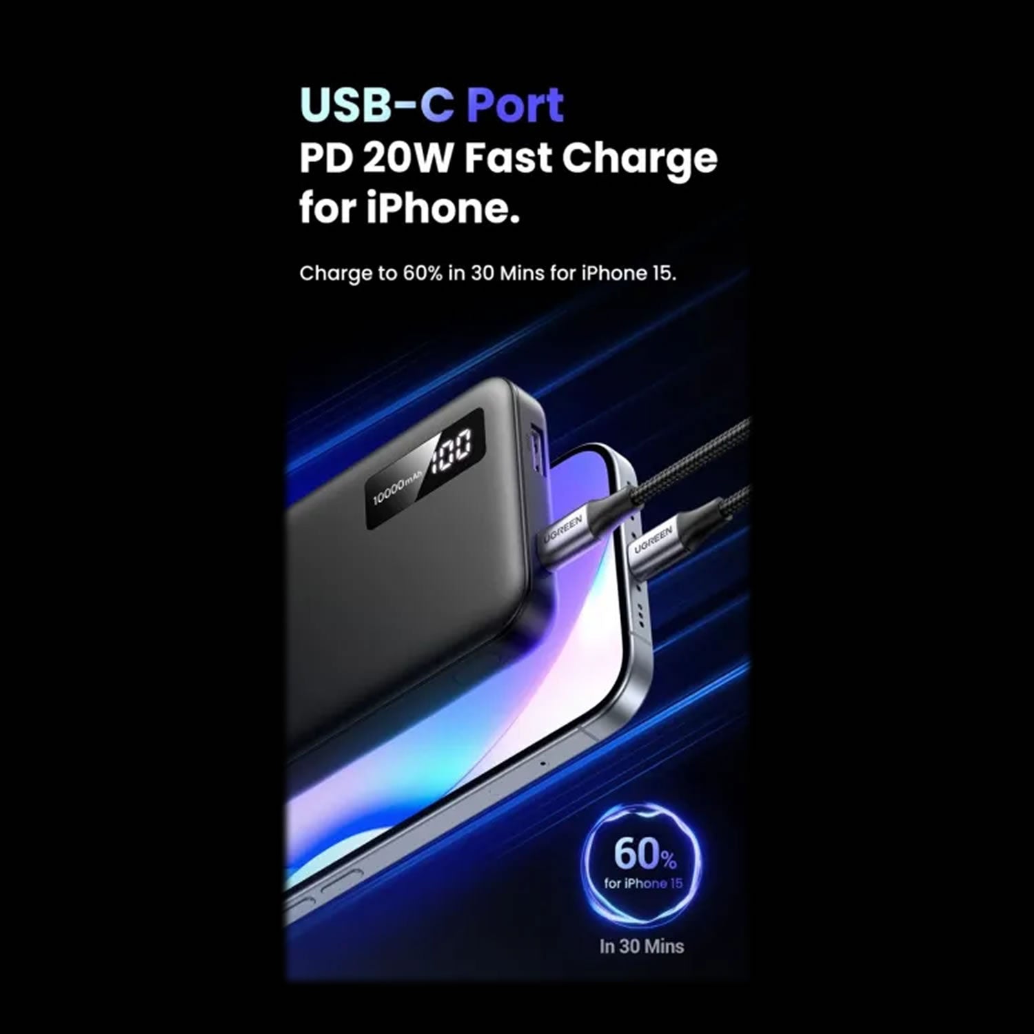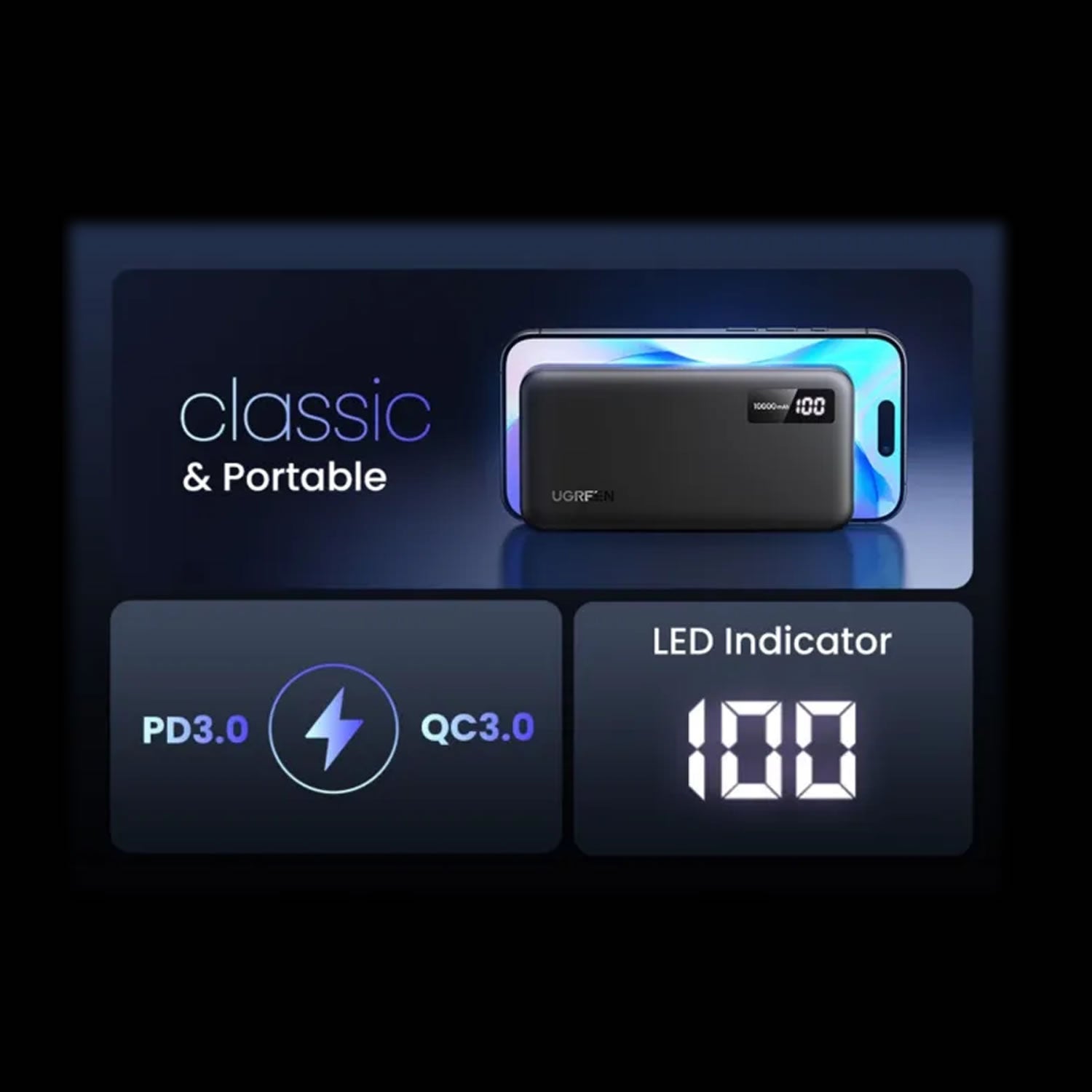 Keep your portable gear charged while you're out and about with the USB-C Power Bank from UGREEN. Equipped with a 10,000mAh lithium-ion battery, the PB311 comes with one 20W USB-C input/output that both charges your devices and recharges the power bank in up to 3 hours using a 20W AC adapter. There is also a 22.5W USB-A output that may be used for charging your mobile devices. Also supported are USB Power Delivery 3.0 and Quick Charge 3.0, while an integrated LED power indicator lets you keep an eye on the charger's status.Its compact and lightweight design makes it easy to carry, providing dependable power whenever and wherever you need it.Designed with multiple protection features, including overheat, overcurrent, and overvoltage protection, it ensures safe and stable charging.