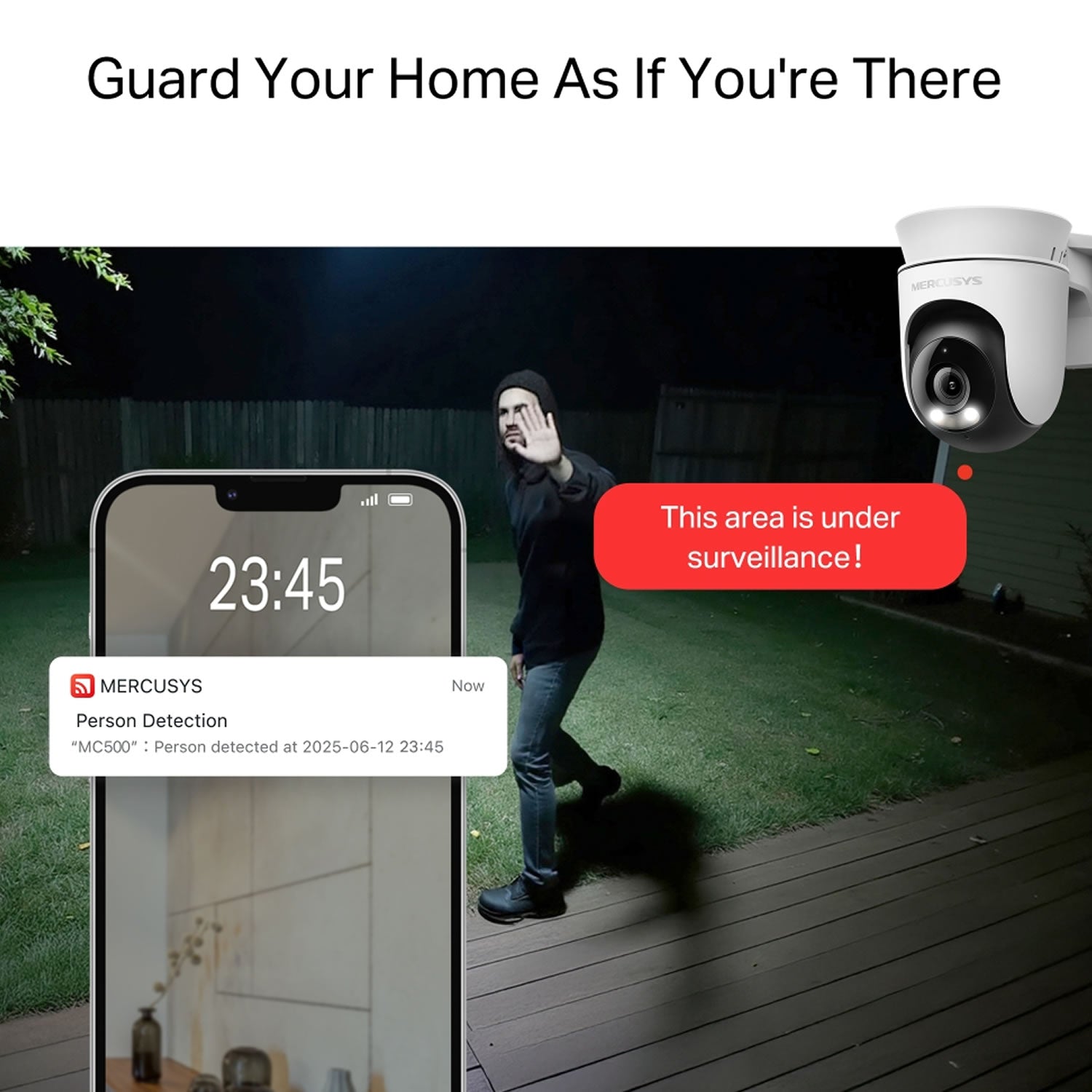 Capture outdoor movement in smooth, reliable 1080p resolution. Ideal for daily visibility and peace of mind. One camera is all you need to keep an eye on your entire outdoor space. It auto-tracks motion and follows preset patrol routes to cover every corner. See clearly after dark with full-color night vision. Even in low-light or near-total darkness, the camera captures clear details and provides round-the-clock protection you can count on. The built-in microphone and speaker let you hear and speak from your phone — whether you're greeting a guest, talking to a delivery driver, or calming your pet. Talk through the camera anytime. MC500 uses smart motion and person detection to ignore distractions like falling leaves or shifting light. When a real threat is detected, it triggers a flashing light and loud siren to alert and deter intruders. With IP65 weatherproof protection, the camera stands strong against rain, dust, and snow. Perfect for outdoor use from sunny days to stormy nights. Supports wall-mount, pole-mount, and ceiling installation, so you can set it up wherever fits your needs.