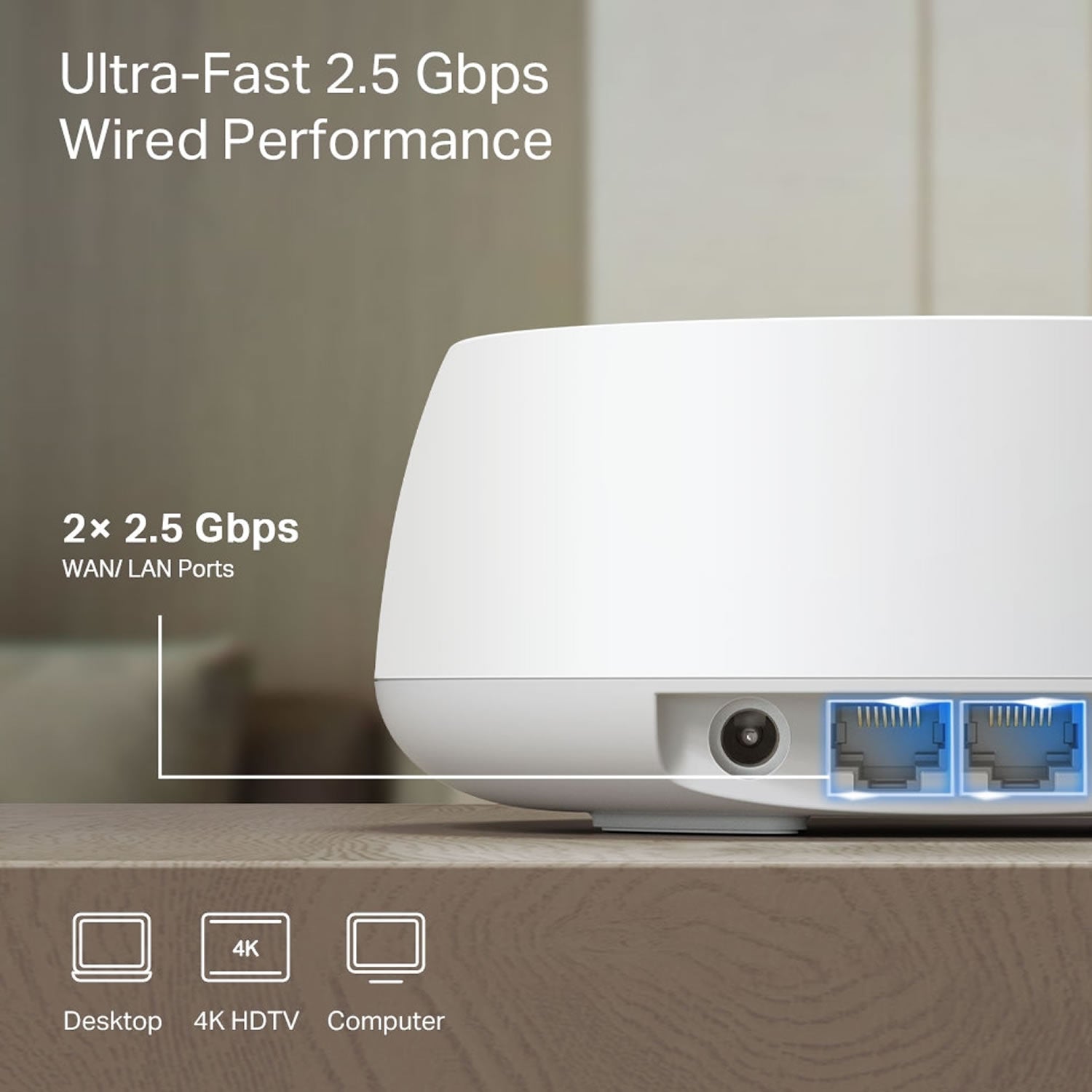 3.6 Gbps Dual-Band WiFi – 2882 Mbps (5 GHz) + 688 Mbps (2.4 GHz). 2.5 Gbps Wired Connections – 2× 2.5 Gbps ports ensure max flexibility and boosted throughput. Wireless and Wired Combined Backhaul – Connects a wireless and wired backhaul with each unit simultaneously to improve overall throughput and reduce latency. Multi-Link Operation (MLO) – Simultaneously send and receive data across different bands and channels to increase throughput, reduce latency, and improve reliability. Seamless AI-Driven Roaming – Forms a unified netwok with built-in AI-Roaming creating the ideal Wi-Fi solution for your home. TP-Link HomeShield – Provides comprehensive network protection, robust parental controls, and real-time IoT security. Universal Compatibility – Backward compatible with all WiFi generations and works with any internet service provider (ISP) and modem
