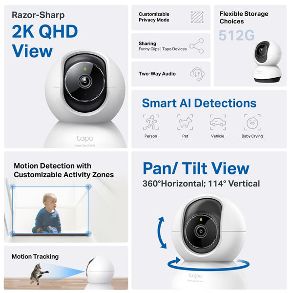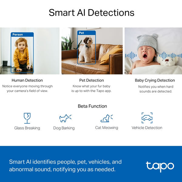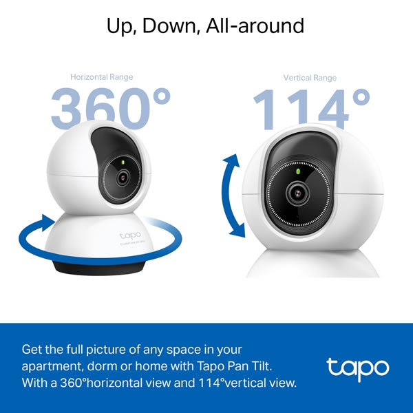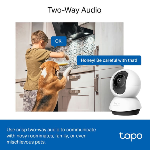 Record all of life's wonderful moments with the realistic 1080p Full High Definition. Zoom to see the sharp views. Smart AI identifies people, pets, and vehicles while recognizing a baby crying and other sounds, notifying users as needed. Control what alerts you receive by creating multiple custom activity zones around areas that matter. Pan/Tilt View! Get detailed look at your room A wide range of coverage to capture every moment. When motion activity is detected, tracks and follows the subject to keep it within view. Save recorded videos on the microSD Card (up to 512 GB) or by using Tapo Care cloud storage services. Use crisp two-way audio to communicate with nosy roommates, family, or even mischievous pets. Set customizable block zones to keep certain spaces from being recorded so you never need to worry about personal moments being leaked. Filter out any personal spaces, like your bed, and only record areas that require monitoring such as doorways and windows to ensure your privacy remains just that—private.